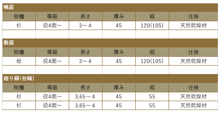 造作材は、 鴨居、 敷居、廻り縁などに使用されます。主な材は杉、 桧です。